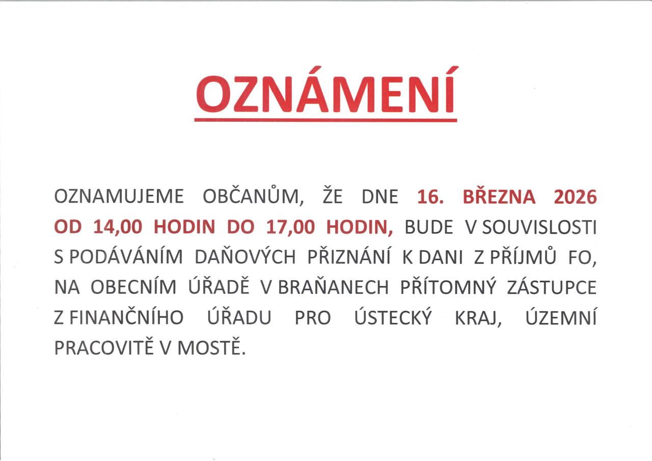 Dne 16.3.2026 od 14 do 17 hodin, bude v souvislosti s podáním daňových přiznání na obecním úřadě v Braňanech přítomný zástupce z finančního úřadu.